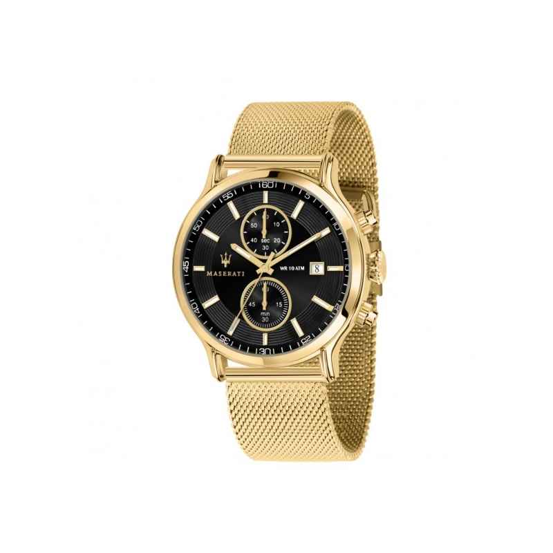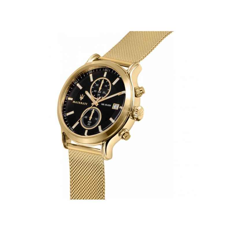 Schwarzes Zifferblatt mit Chronograph Funktionalität : schwarzes zifferblatt ist gekennzeichnet durch goldindizes und hände , die einen auffälligen kontrast schaffen und die lesbarkeit erleichtern. Das Zifferblatt ist mit chronographenzähler und fenster für daten um 3 uhr positioniert, die funktionalität zu ästhetischem design hinzufügen. Die Signatur Maserati, mit dem berühmten Trident, ist stolz auf das Zifferblatt positioniert, drückt die Sport-DNA und die Exzellenz der Marke.