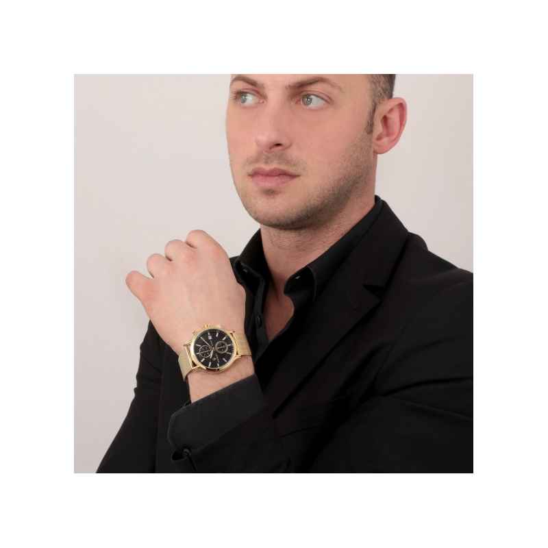 Material und Gehäuse : goldene edelstahl mexikanerband gibt dem modell einen anspruchsvollen und modernen look, perfekt, um eine luxuriöse note zu jedem outfit hinzuzufügen. Die gold IP Stahlgehäuse einen durchmesser von 42 mm , ideale größe, um eine sichtbare, aber elegante präsenz am männlichen handgelenk zu bieten. Diese Kombination macht die Uhr robust und langlebig, sowie extrem faszinierend.