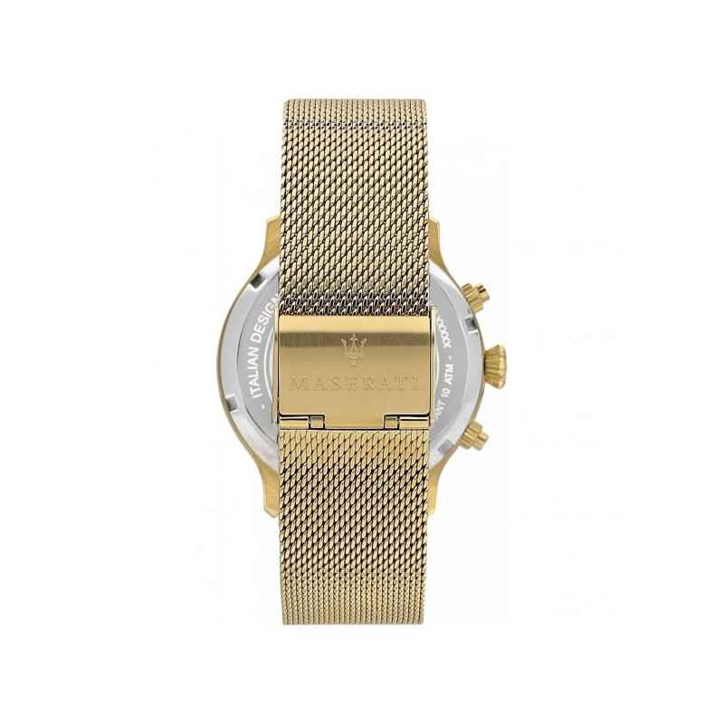 Qualitätsmaterialien und ikonisches Design : gemacht in goldener edelstahl und mit einem Mailänder Strickband sieht die Maserati Epoca Uhr wie ein hochwertiges Accessoire aus. Jedes Detail wurde entworfen, um maximalen Komfort und tadellose ästhetische Leistung zu bieten, inspiriert von den glatten Linien und dem Luxus von Maserati Autos.