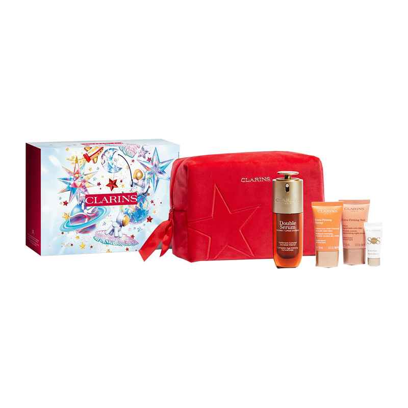 El Clarins Set Double Serum + Extra-Firming es una exclusiva caja antienvejecimiento de cuidado de la piel que contiene 4 tratamientos faciales de alto rendimiento, perfecto para una rutina completa hidratación, tonificación y brillo. Todo está encerrado en una hermosa clarines embrague rojo en tela de terciopelo, elegante y reutilizable, ideal también como una idea de regalo.