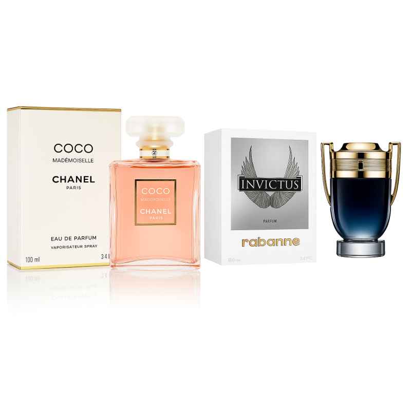 El estuche Chanel Coco Mademoiselle + Paco Rabanne Invictus contiene dos fragancias icónicas de la perfumería moderna: el refinamiento femenino y sensual de Coco Mademoiselle y el poder magnético y victorioso de Invictus.