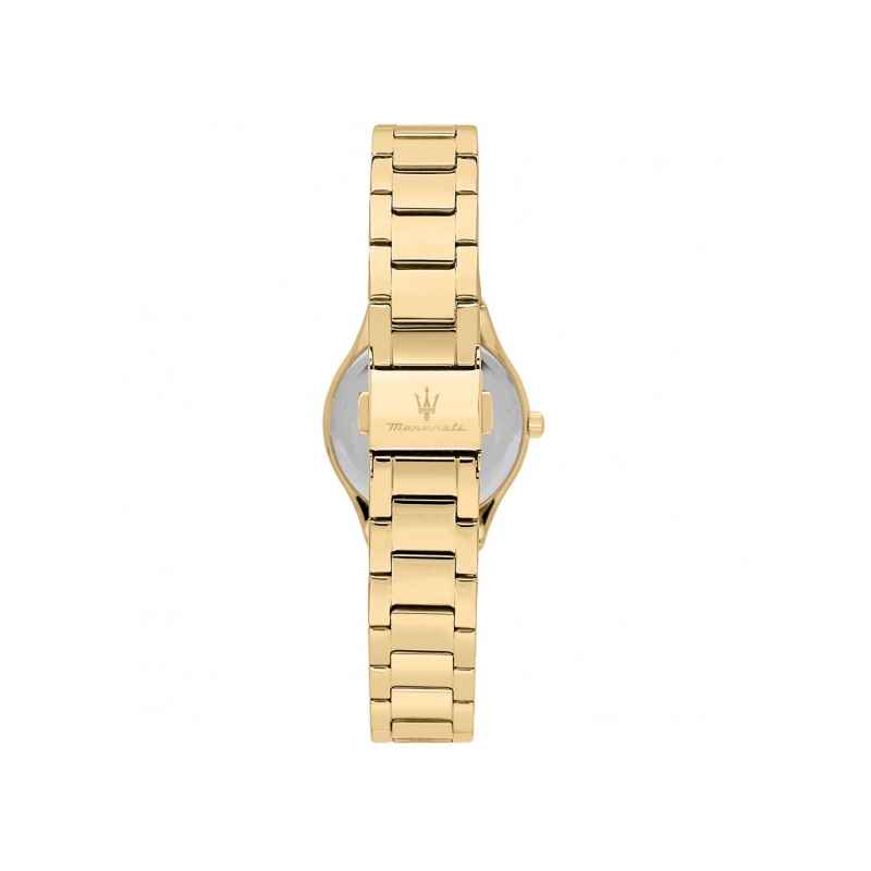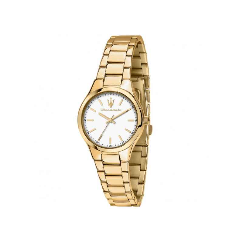 ALLÍ 'Ver Maserati Atracción R88531501 se caracteriza por un diseño sofisticado y materiales de alta calidad. El caso y la correa están hechos de acero inoxidable dorado, con un acabado brillante que da un aspecto lujoso y brillante. El dial es elegante color blanco, decorado con índices de oro y un logotipo icónico de Maserati a las 12 en punto, que subraya la firma de la marca de la excelencia. Los índices sutiles y las manos doradas ayudan a crear un aspecto limpio y minimalista, perfecto para los amantes del estilo refinado y sin exceso.