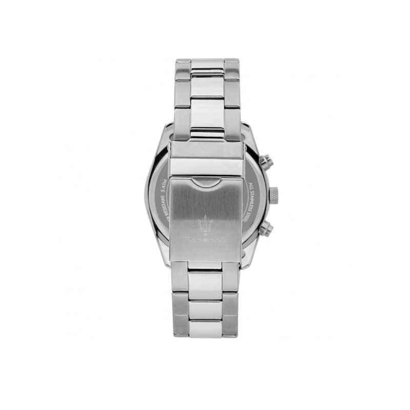 El esfera blanca es el punto focal de este reloj, con índices y manos de plata ofrecer legibilidad óptima y estética limpia. En el dial también hay tres subcuadrantes de cronógrafo, resaltados por detalles en negro, que permite medir el tiempo con precisión y añadir una nota deportiva a la elegante apariencia del modelo. A las 4 en punto hay una ventana miembro, un detalle funcional y discreto para hacer un seguimiento de la fecha de una manera práctica. El logo Maserati, ubicado a las 12 en punto, confirma la membresía de la prestigiosa marca italiana.