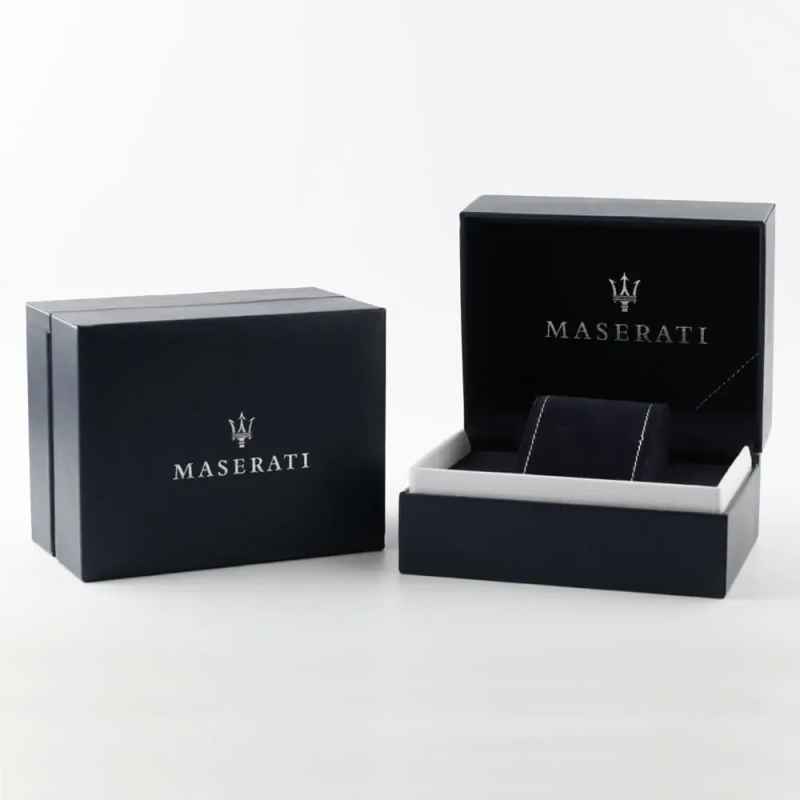 The cadran couleurs argentées caractéristiques d'or détails, y compris mains et index, qui offrent un contraste lumineux et rendent l'horloge facilement lisible. A 3 heures, il y a un fenêtre de la date, utile pour toujours vérifier le jour du mois. Le logo Maserati, positionné à 12 heures, domine le cadran avec une présence emblématique qui donne personnalité et style.