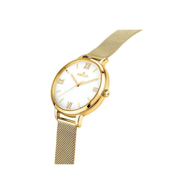Design élégant et raffiné: Le cadran blanc avec index dorés et le bracelet en mailles dorée donnent à la montre un look lumineux et élégant. The index romains (XII et VI) et la brillance du bracelet en mailles d'or enrichissent encore le design, ce qui le rend idéal pour ceux qui recherchent une montre qui attire l'attention sans être trop flashy.