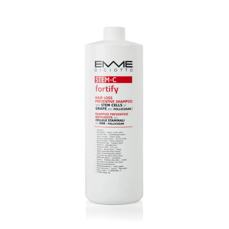 STEM-C Fortify Hair Loss Preventive Shampoo, thanks to the combined action of two vital ingredients, such asactive vegetable stem cells of grapesand theFollicusan,STEM-C Fortify Shampoois able to prevent hair loss by stimulating regrowth. Theactive vegetable stem cells of grapesperform deep action on the skin, rebalancing oxygenation and nourishment of the hair bulb andreactivating normal functions. TheFollicusan,a powerful protein complex combined with provitamin B5 (essential active ingredient able to revitalize cells), provides a remarkable improvement in blood microcirculation thatstimulates hair growth.