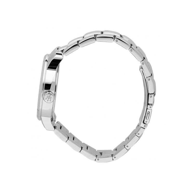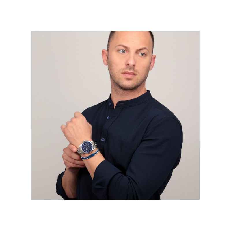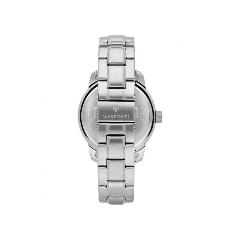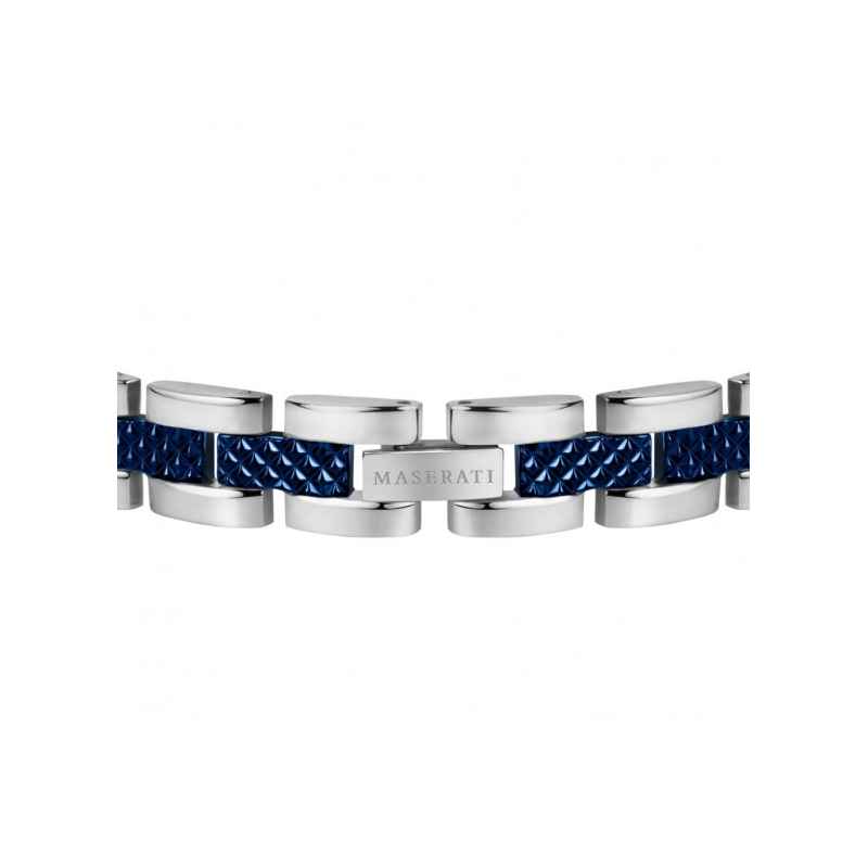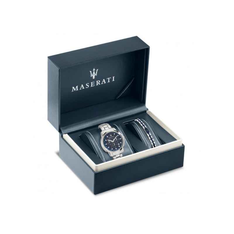 Il set include anche un bracciale in acciaio inossidabile con dettagli blu, coordinato perfettamente con l'orologio. Il design del bracciale riprende l'estetica sportiva e lussuosa del brand, con il logo Maserati che conferisce un ulteriore tocco di esclusività.